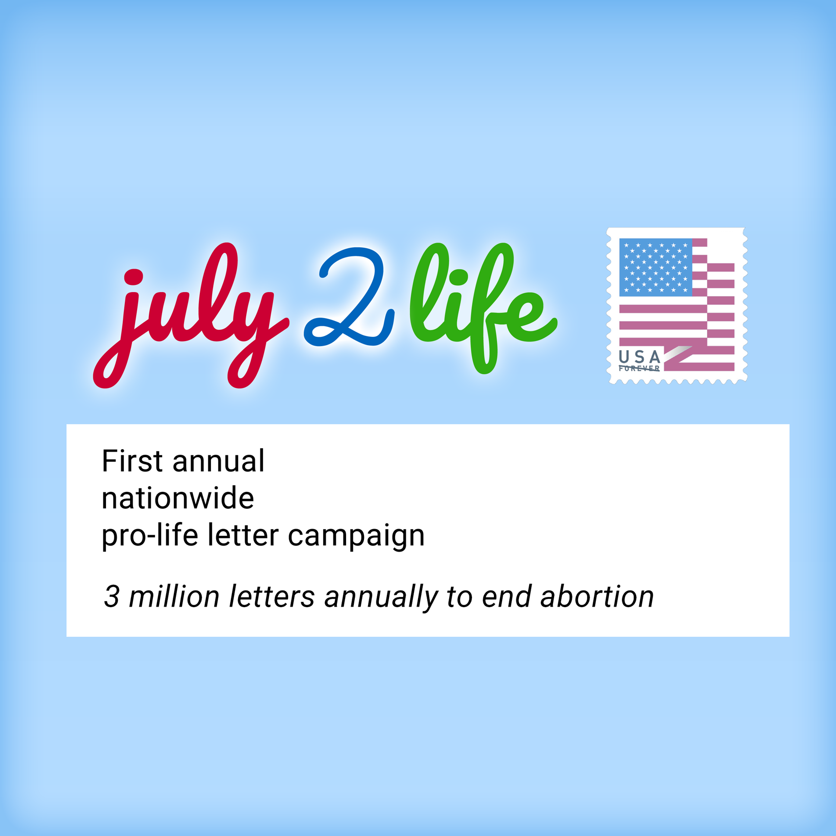 3 million letters is...✓ 3 times the world record ✓ 3 times the number of annual abortions “One fourth of my generation is missing because of abortion.” ✓ Historically effective For every one who dies from gun violence, more than 63 die from abortion.Life begins at conception.Never at birth. | How can you help guarantee success? Most importantly, you should personally set the example, and send your own pro-life letter.Mark your calendar for July 2nd.All it takes is one stamp and five minutes. “Every pro-life American should do this as part of their civic duty.” Prepare your letter now! Mail it July 2nd! Get email reminders! let us know you're on board ☐ Follow us on Social Media (links below) ☐ Contact us for information on the Promoter's Program (email below) ☐ Print letters for your family ☐ Send pro-life letters from your church ☐ Go through each of your phone contacts and Facebook friends one at a time and get them involved! “We will acheive 3 million letters annually.The only question is how long until we do.” |